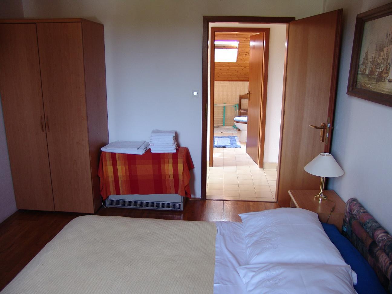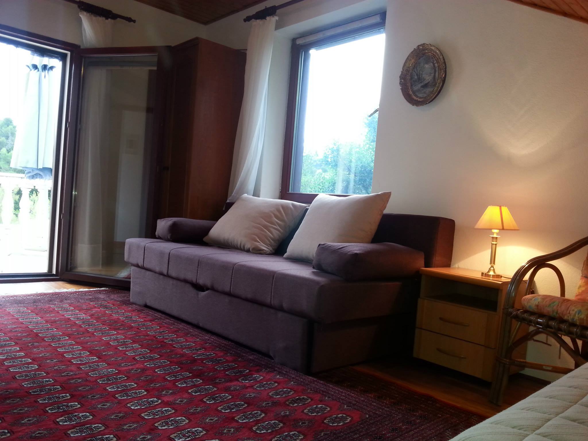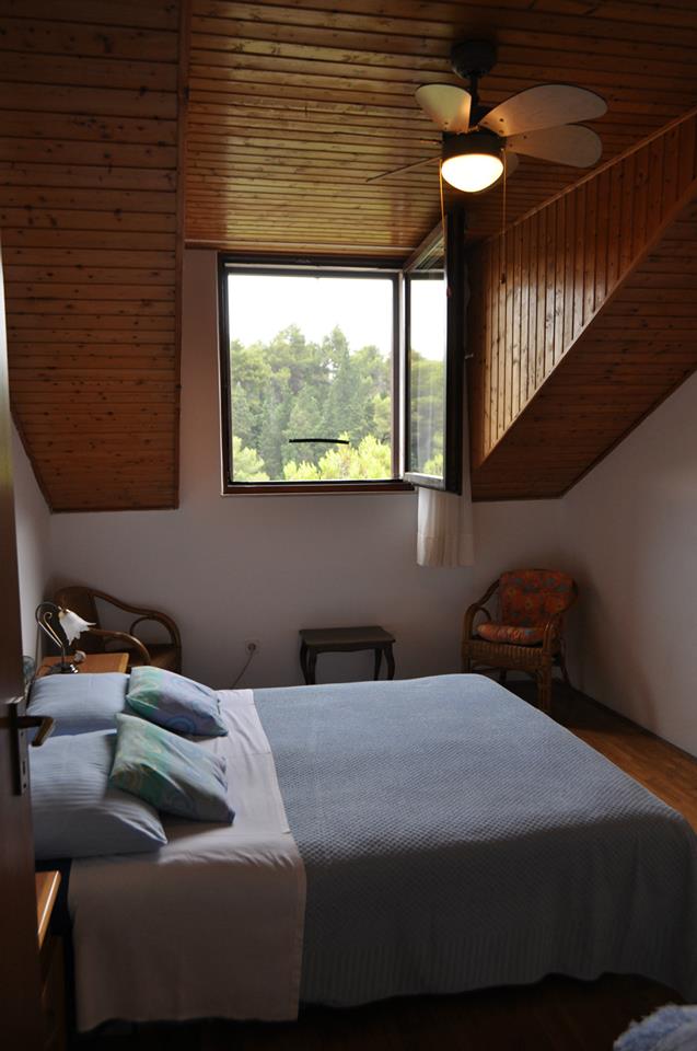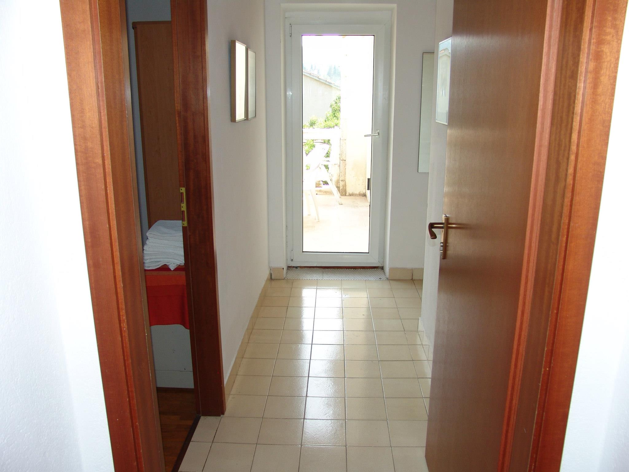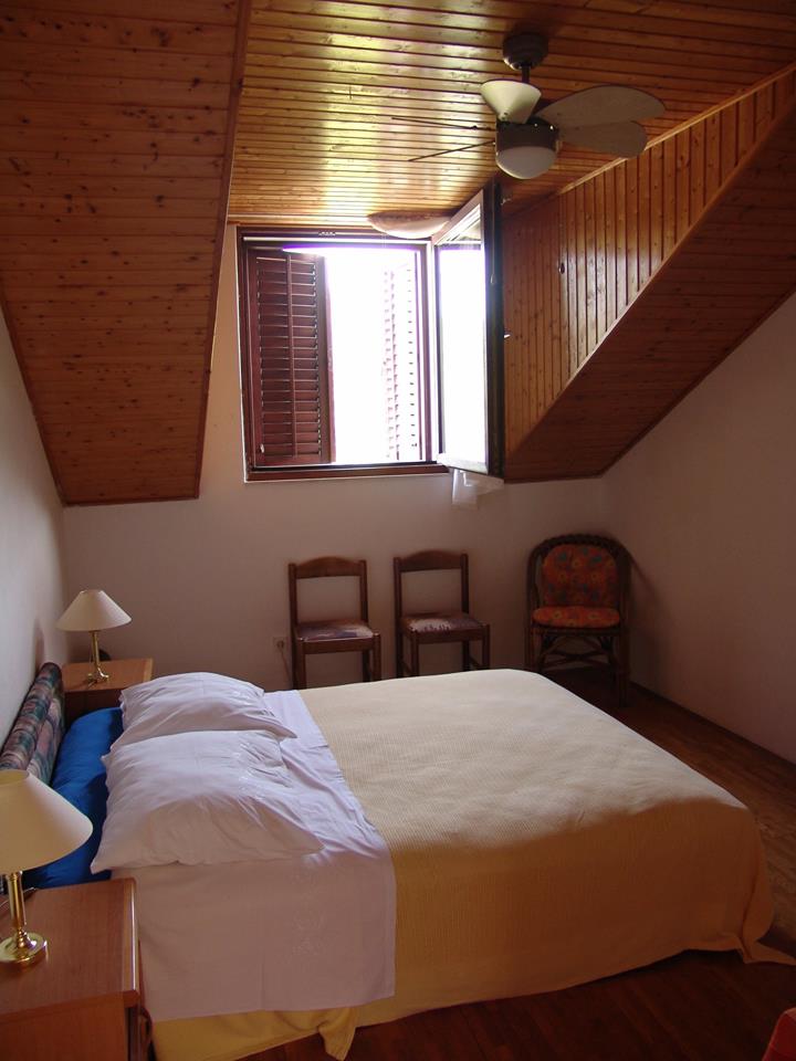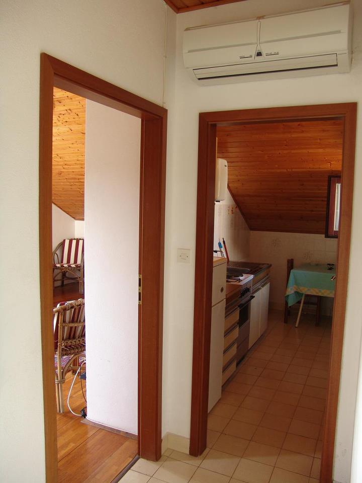 Apartment R in the first house on the second floor with a beautiful semi-round terrace with the view to the sea and with a slanting roof. It consists of two separate rooms, a bedroom with a twin bed and a living room with two beds, a kitchen and a bathroom. The apartment is air-conditioned and is ideal for the accommodation of 4-5 persons.