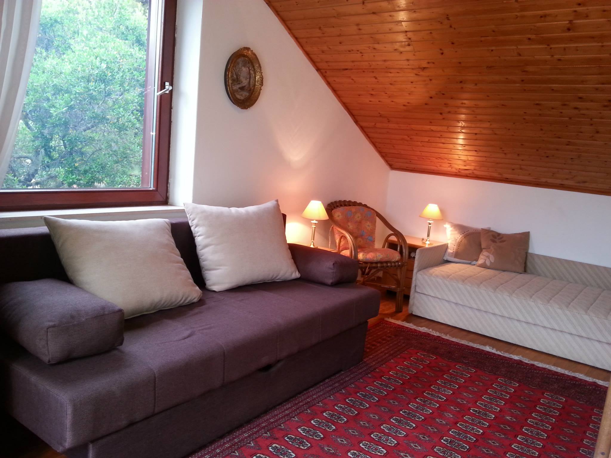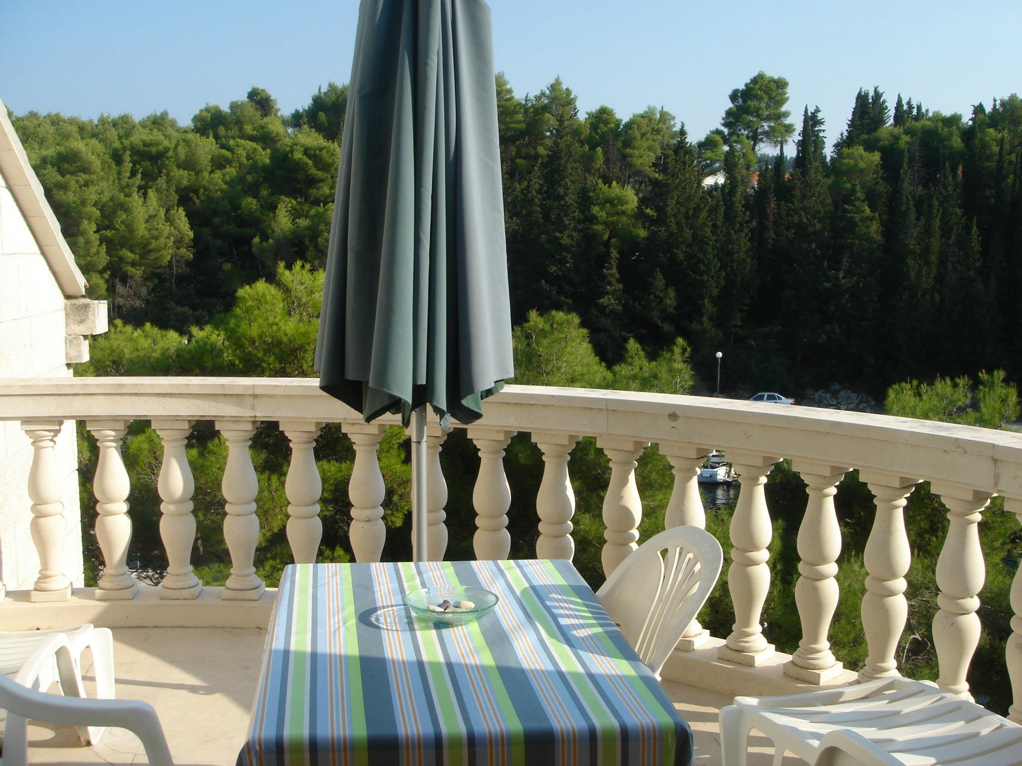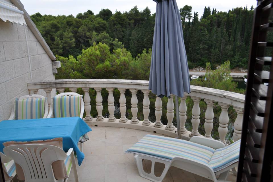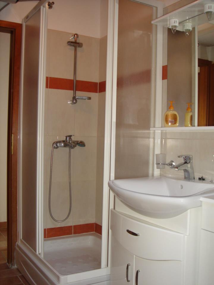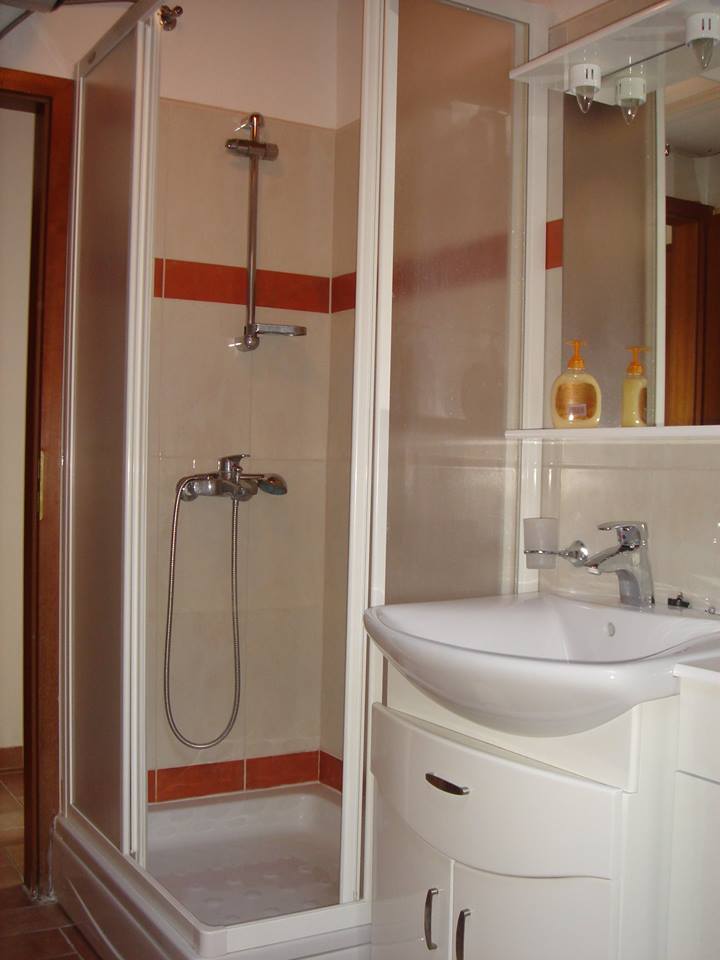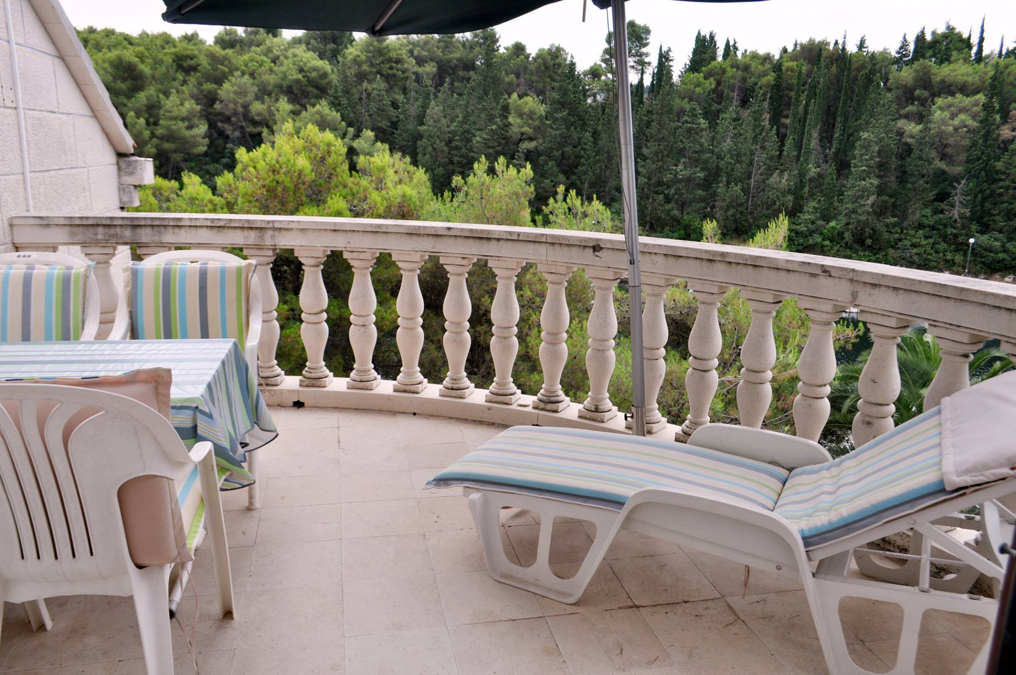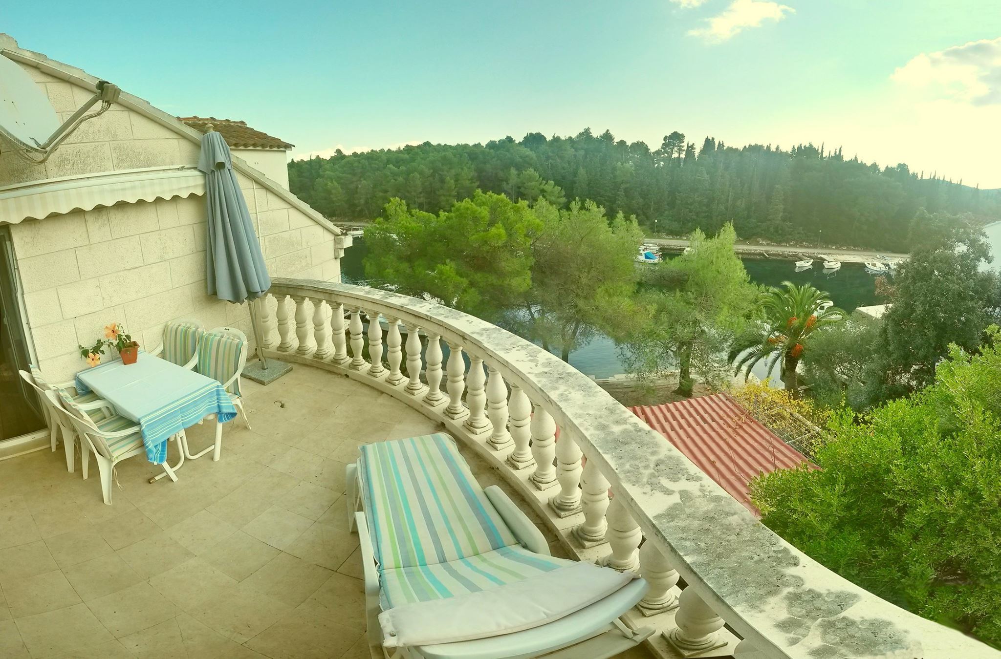 Apartment R in the first house on the second floor with a beautiful semi-round terrace with the view to the sea and with a slanting roof. It consists of two separate rooms, a bedroom with a twin bed and a living room with two beds, a kitchen and a bathroom. The apartment is air-conditioned and is ideal for the accommodation of 4-5 persons.